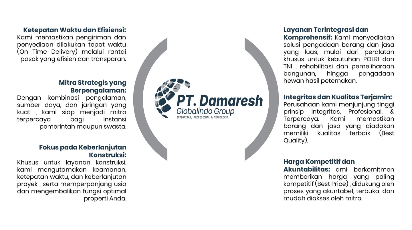 PT. Damaresh Globalindo Group adalah perusahaan yang berfokus pada pengadaan barang dan jasa, mencakup pengadaan peralatan dan perlengkapan untuk POLRI dan TNI, rehabilitasi/pemeliharaan bangunan, dan pengadaan hewan hasil peternakan. Kami siap menjadi mitra strategis bagi Pemerintah, BUMN, swasta, dan pelaku industri profesional dengan kombinasi pengalaman, sumber daya, dan jaringan yang kuat